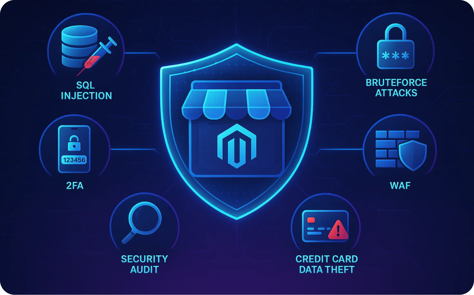 У 2025 році кібербезпека перестала бути опціональною; вона є фундаментом довіри та юридичної відповідності eCommerce-бізнесу. Магазини на Magento 2, через їхню популярність та модульну структуру, є постійною мішенню для кіберзлочинців. Основні загрози, з якими стикаються власники: SQL-інʼєкції (злом через неперевірені запити до бази даних), брутфорс-атаки на панель адміністратора та, найкритичніше, крадіжка карткових даних (порушення PCI DSS). Забезпечення надійного захисту вимагає комплексного, проактивного підходу.
