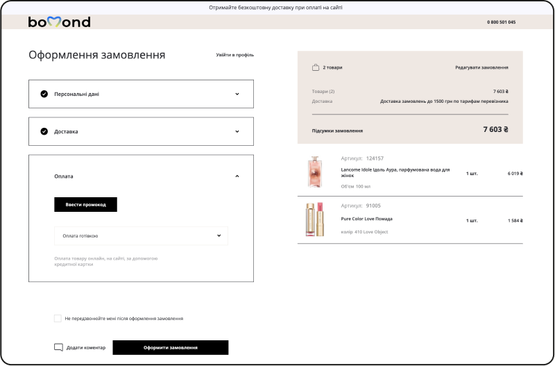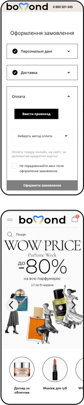 Максимально спростили чекаут, інформацію у формі замовлення структурували та розбили на смислові блоки шляхом візуальних акцентів.